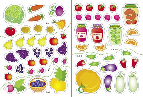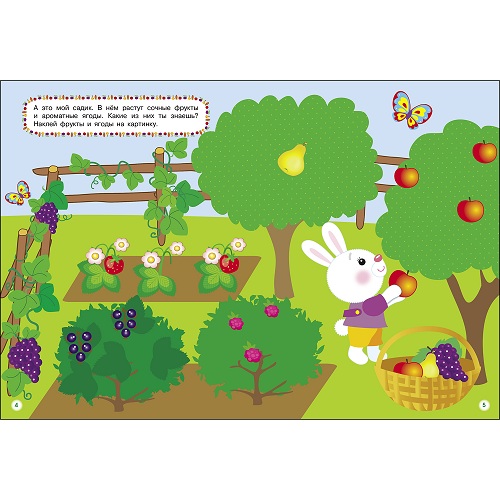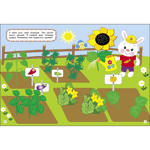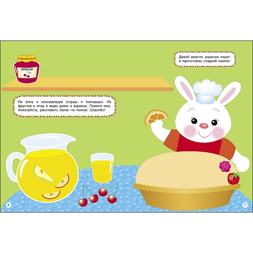 Пушистый зайка ждёт гостей, и ему просто необходима помощь вашего малыша. Ну что же, за дело? Играя с многоразовыми наклейками, малыш поможет зайке сварить борщ, вырастить овощи на огородике, фрукты-ягоды в саду, а также сварить компот и украсить пирог к приходу гостей.