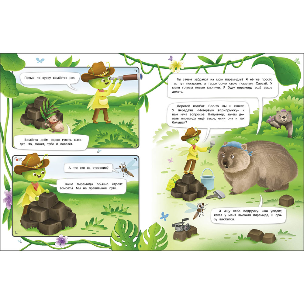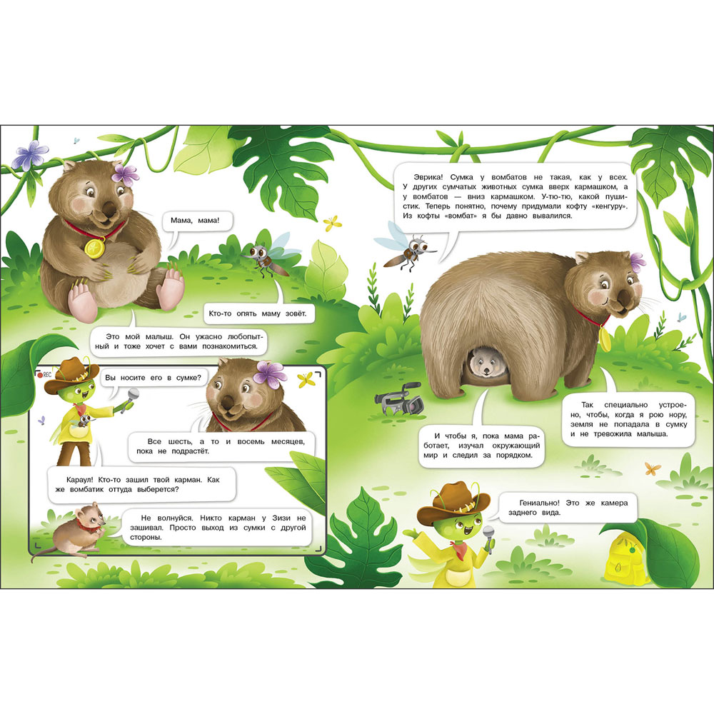 Кузнечик Пружинка — репортер в мире животных. В его волшебном рюкзаке найдется все, что поможет взять интервью у любого животного: и в непроходимых джунглях, и в жаркой Африке глубоко под водой и высоко в небе. В каждом путешествии Пружинку ждут невероятные открытия, новые друзья и удивительные приключения. На страницах книги ваш ребенок прочитает интервью репортера Пружинки с малоизвестным в России зверьком вомбатом.