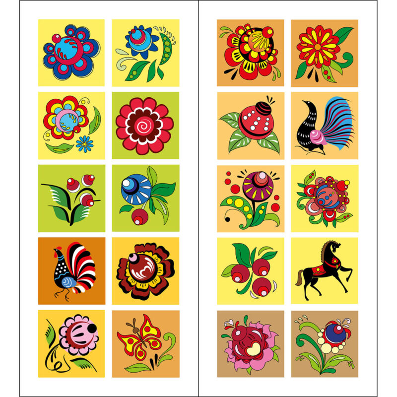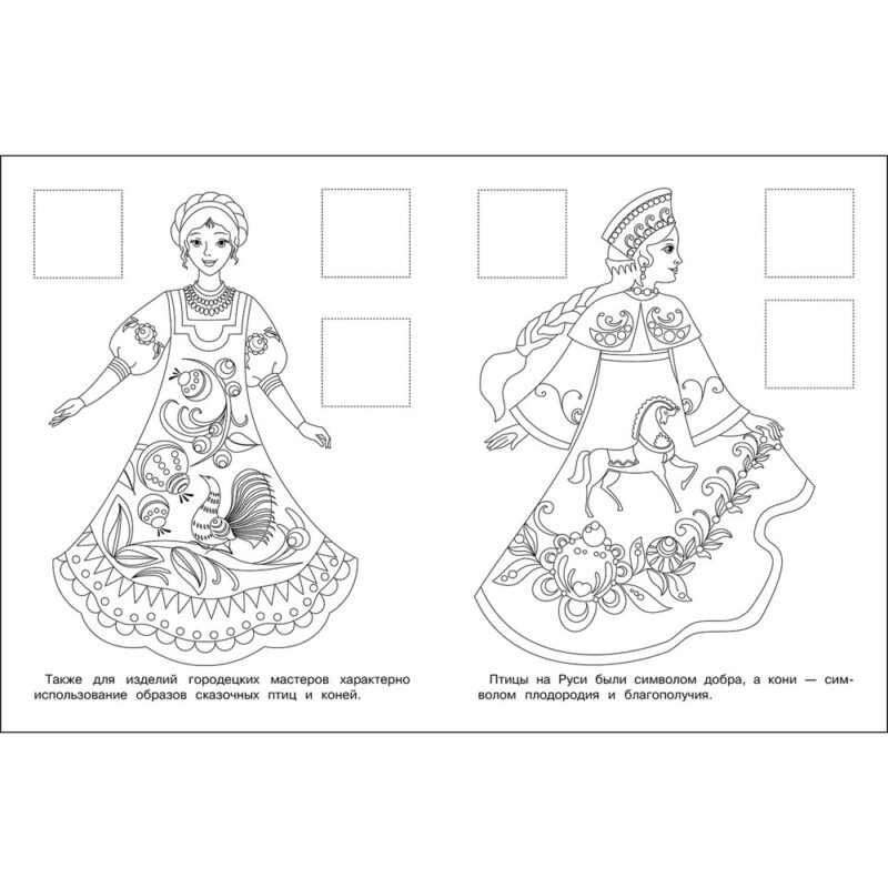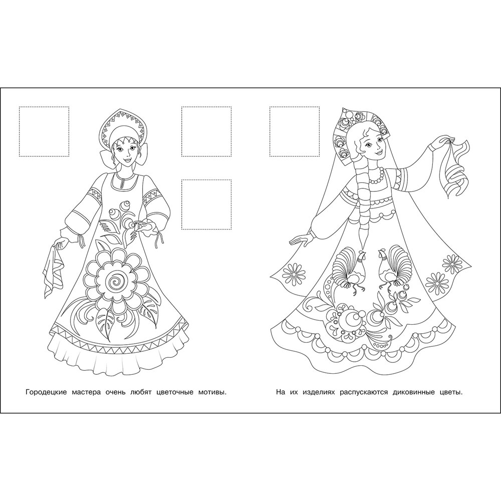 На страницах этой книжки русские красавицы познакомят ребенка с великолепной городецкой росписью. Он сможет раскрасить узоры на платьях и узнать об истории росписи, ее основных элементами и традиционной цветовой гамме. А наклейки подскажут, как раскрасить картинки. Наклейки можно приклеить на страницы книжки, а можно украсить ими тетрадки или предметы в детской.